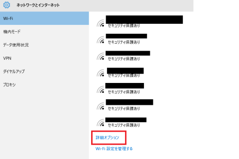 設定ーネットワークとインターネットーWi-Fiを開き詳細オプションを選択