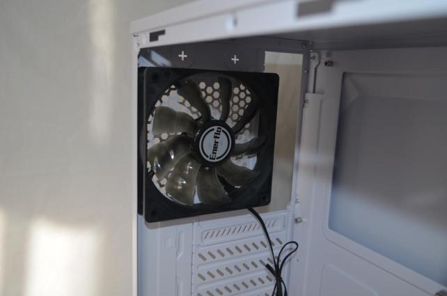 フロントパネルを開けるとファンがついています。ずらしてファンを2個設置できます。