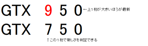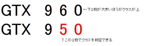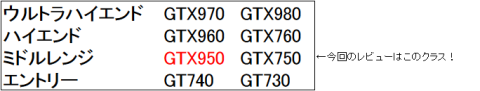 GTX950なら下2桁の数字50。つまりGTX950の上はGTX960・GTX760、さらに上のクラスになるとGTX970・GTX980と言う事です。