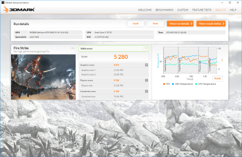 続いてFire Strike。For high perfomance gaming PCsというFireStrikeの中で最弱。ですが、ベンチマークとしては結構な重さのものとなってます。また、ゲーミング環境に近い状態のベンチマークとなるので、現在の標準的なベンチマークと言えるでしょう。