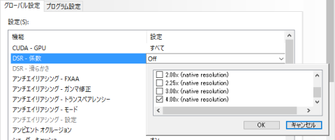 DSRはNVIDIA GeForce ExperienceとNVIDIA コントロール パネルで設定が行えます。NVIDIA GeForce Experienceだと同時に最適化設定を行う事になるようです。NVIDIA コントロール パネルの方が項目が多く、細かい設定ができます。GeForce Experienceは、NVIDIA コントロール パネルの設定を行っている感じがするし、NVIDIA コントロール パネルでチェックした解像度はNVIDIA GeForce Experienceの方でも使えるようになるので、基本的にはどちらで行っても同じようです。最適化も含めて手軽に行う場合はGeForce Experience、細かい設定を行いたい場合はNVIDIAコントロールパネルといったところです。