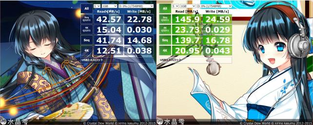 画像左は「USB2.0スロット接続」、右は「USB3.0接続」でのベンチです。