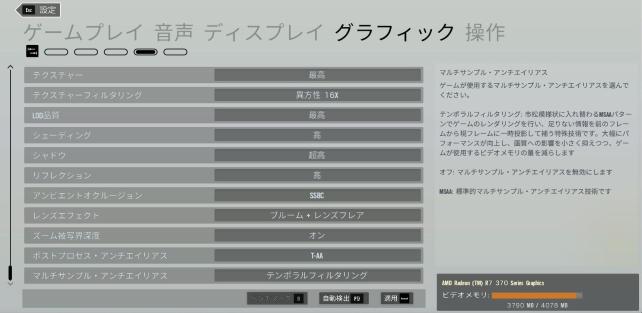 ここ最近、どっぷりハマって遊んでいる、RainbowSix Siegeのビデオ設定画面。