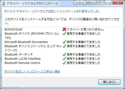 Windows 7 PCに喜び勇んで接続すると、「Bluetooth デバイスの表示」画面より「デバイスの追加」にて正常終了と表示されるものの、通常はその後に関連ドライバの追加が行われるのに何も起こりません。