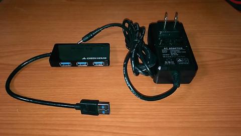 ACアダプタがあまりに巨大なので使用せず、別のUSBハブ(USB2-HUB4XA-BK)に付属のUSB-DCケーブルを使用しています。