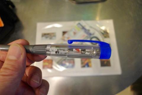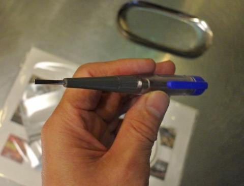短い穴の方(右側)にゆっくりと刺し込むと、透明樹脂で成形された検電ドライバー内部に仕込まれてる赤色LEDがぴっかりと光ります。