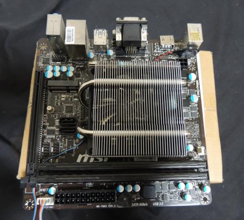 装着状態はこんな感じ。出来ればヒートパイプを横向きに搭載したいところなのだが、MSI AM1-Iだと、どっちに向けてもメモリに干渉してしまうので、縦向きに装着した。