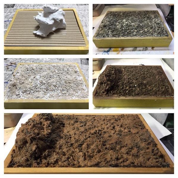 まずは、百均で購入した木枠にボール紙で底上げした後 紙粘土を盛り付けます。
