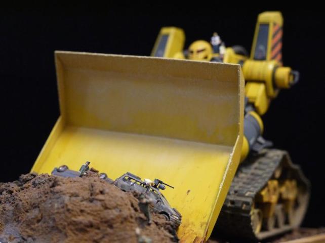 形が出来上がったら、サーフェイサーを吹き付けて コマツの重機っぽい黄色で塗ってみました。
