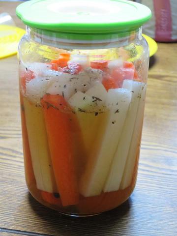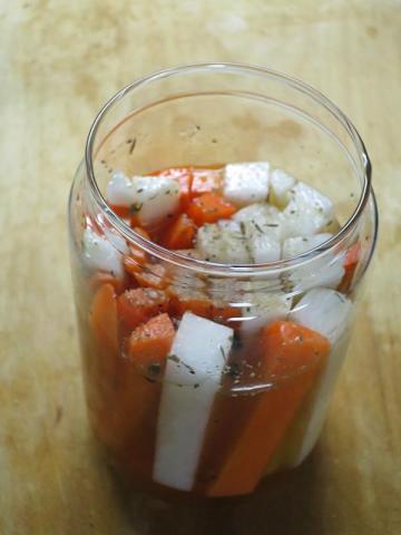とここで、今回大根とにんじんを使ったのですが、先のレシピを読むとピクルス液に漬ける前に野菜にハーブソルトをかけ 1時間置くとあったのが抜けていました(--;