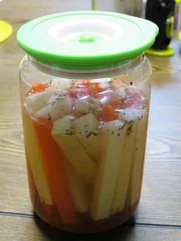 時間をかけていいなら、普通のタッパにピクルス液を入れて野菜を入れ一晩つけておくだけで出来るので、普段料理などしていない私のような者でも簡単にできます(^^