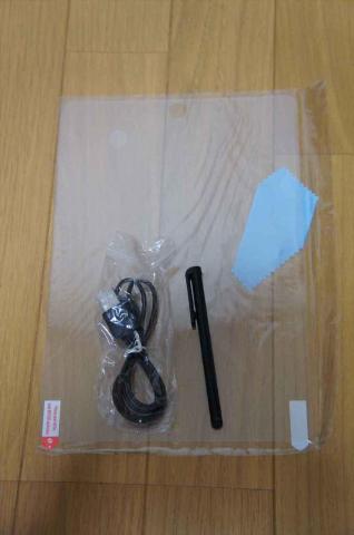 付属品は、タッチペン、充電用のMicroUSB-USBケーブル、保護フィルムです。