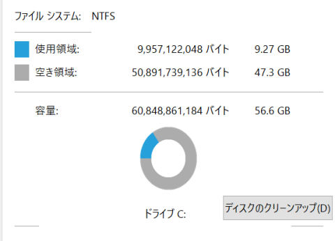 先ほどのビルドアップデートを終わらせた状態でも使用分は18GB弱で39GB程の空き容量があり、アップデート関連バックアップファイルを消したクリーンな状態なら使用分は10GBにも満たない。