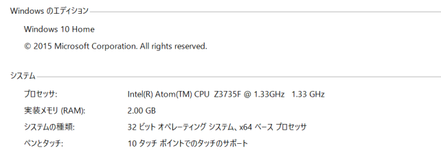 搭載OSはWindows10 Home 32bit。8.1Bingと同じ小型端末向けのライセンスと思われるが特に通常の10Homeと差異はない。