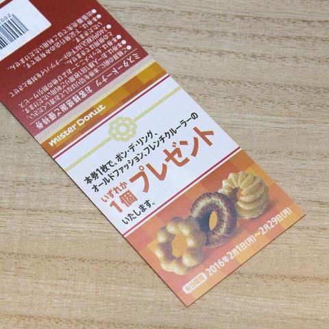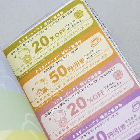 ドーナツ 1個の引換、コーヒー 1杯半額、ドーナツ10個まで 20%引きの優待券が、1月分と2月分の計 6枚が綴られたモノでした。