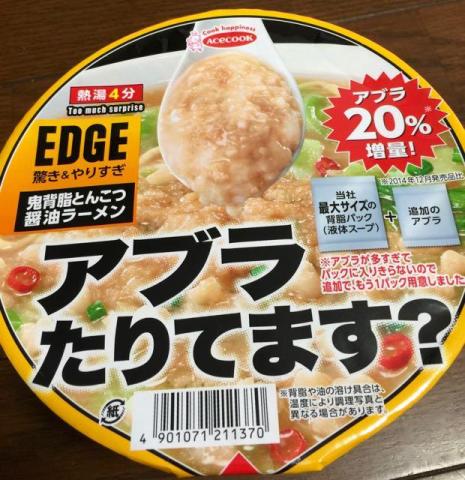 パッチコです。以前からウオッチしてるブランド「edge」ですが、辛さではなくアブラをマシマシにしてしまったカップ「鬼背脂とんこつ醤油ラーメン」です。2014に発売された製品のリニューアル版のようです。