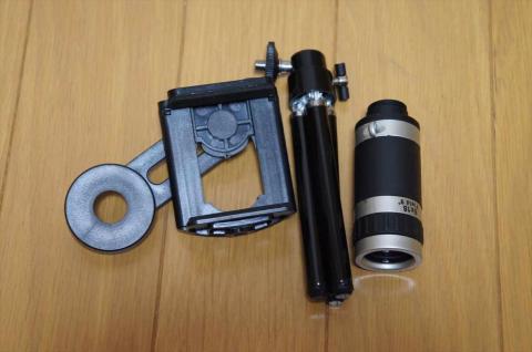 製品構成は、望遠レンズ、三脚、ホルダーです。