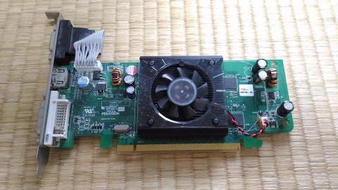 シールにボード及びGPUらしき型名が入っていない謎のPCI-E接続のグラフィックカードです。ただ、ボードやファンの形状、及びHDMI端子があることからGeForce8400GSあたりかと思われます。