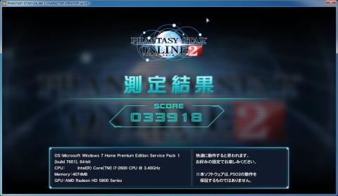慣らし運転を兼ねて、Corei7-2600/4GB/2TB-HDD/H67環境でPSO2 V2.0(1280x720)ベンチを走らせてみました。
