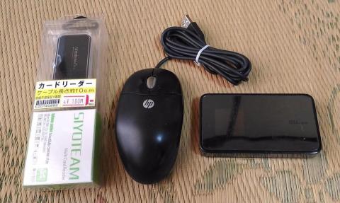 カードリーダーは何かと使うことがある。SD/MS専用だがMiniもMicroもそのまま挿せる使いやすいタイプ。光学マウスは使いやすい形状だが、使用感満載(´・ω・`) モバイルルーターは燃えないゴミ。