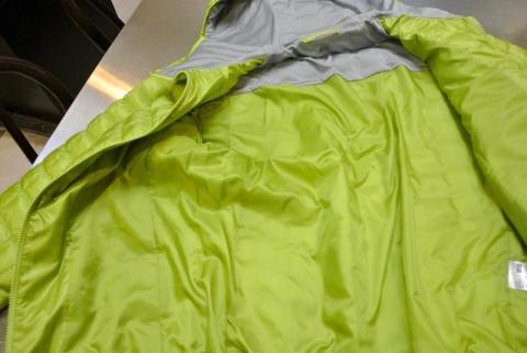 表地も裏地も、光沢感のあるポリエステル素材ですが、フード部と首周りは色目の異なる起毛素材が配されており、地肌が感じる冷たさを防いでくれます。