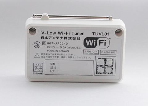 Wi-Fiチューナーでスマホから視聴可能なものとなるので、SSIDとそのデフォルトキーが記載されています。本体はリチウムイオン電池駆動です。