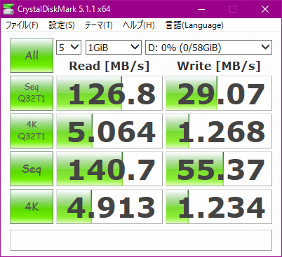 確かに読み込みは 130MB/s 程度でカタログ性能に偽りはないんですが、書き込みが遅いんですよ。