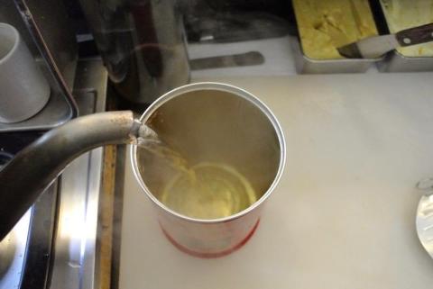 缶の中にこびりつくように残った味覇。 その缶の中に熱湯を注ぐだけで上湯(しゃんたん)スープが出来上がります。