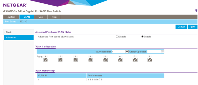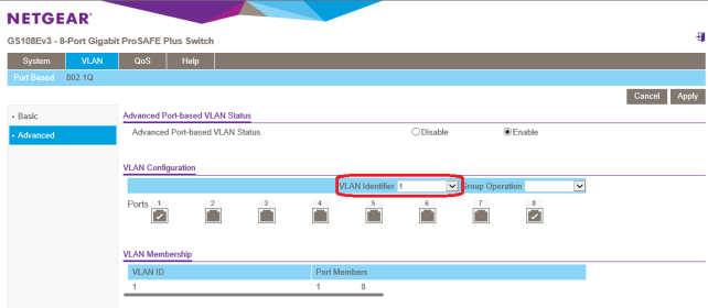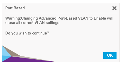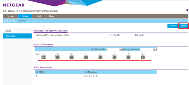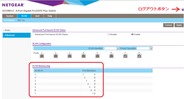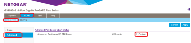 VLAN>Port Based>Advanced Advanced Port-baced VLAN Statusを、「Enable」にします。
