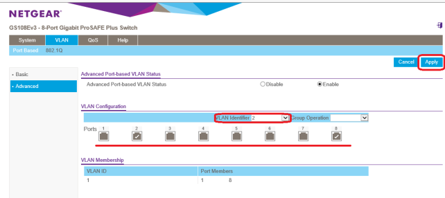 上記と同様にPC2のPort2とWANのPort8のみチェックをいれVLAN Identfierを2にして右上の「Apply」ボタンをクリックします。
