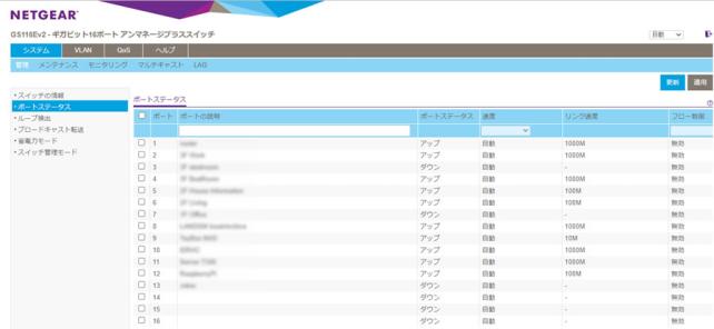 16個あるポートは横一列などで扱いやすいです。上下にあるタイプは指をひっかけにくくて抜き差ししにくいですね。ただ、よくあるインジケータがまとめられていないので、接続したケーブルが点滅による情報の読み取りは難解です。だけど管理画面からそのへんの情報を見ることができるので、むしろそっちの方が見やすくて使いやすくて良かったりします。