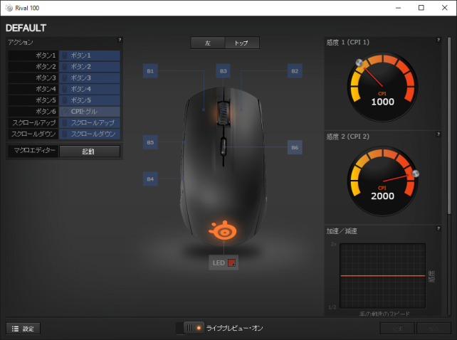 そのため、ブラウザで使うときは高DPIで素早く選ぶ、写真編集操作やCG作成などの細かい作業のときは低DPIかつ加速度低め、もしくは無しといった設定が可能。
