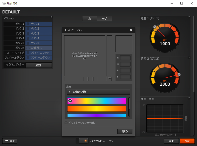 この辺りの設定は、メーカーサイトにてDL出来る SteelSeries Engine によって、自分の好みで変更が可能。