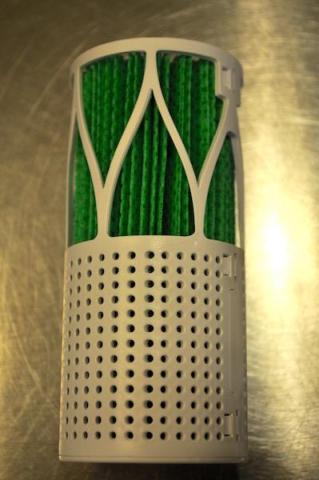 ディンプル部分は水に浸かっていますが、その水が上に見える折り畳まれた緑色・襞上のフィルターへ吸い上げられます。