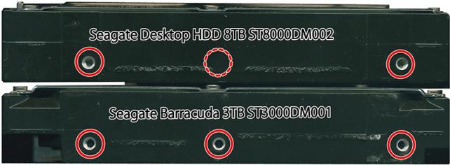 Seagate Desktop HDDのうち、プラッタ(内部の磁性体を塗布した金属ディスク>ハードディスクの語源)が6枚のHDD(8TB,6TB,5TB)は、上記のようなネジ穴レイアウトのようです。
