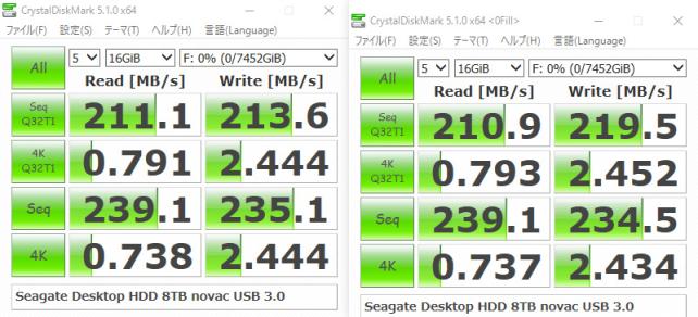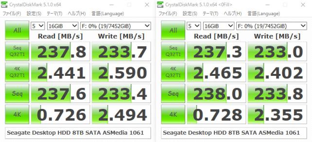 Seagate Desktop HDD(3TB) ST3000DM001は、1TBプラッタ 7,200rpmモデルですが、それと比較しても、ベンチマークソフトを走らせた限りでは、Seagate Desktop HDD(8TB)は、シーケンシャルリード/ライト共に230MB/sオーバーでとても高速なHDDです。