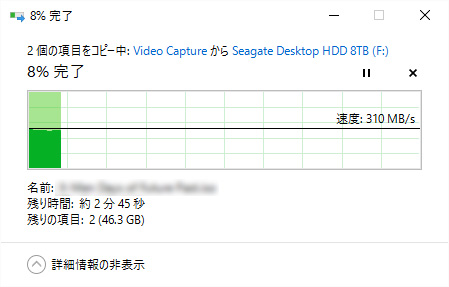 デスクトップPCに接続した4TB HDD x2(RAID-0)ドライブに保存していたHDビデオデータ50.4GBを、Seagate Desktop HDD(8TB)にコピーしてみました。