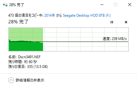 このRAWファイルを約470コマ、約18.9GBのファイルを、HDビデオ同様、Seagate Desktop HDD(8TB)にコピーしてみました。
