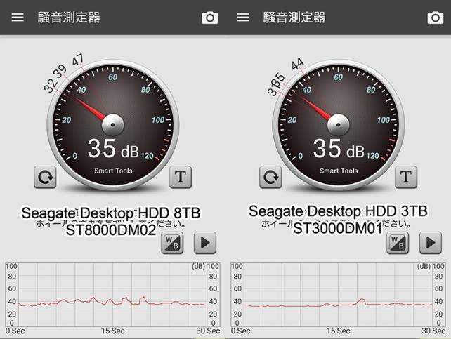 わずかですか、Seagate Desktop HDD 8TBは、3TBモデルより3dB程ノイズのピークが大きく計測されました。