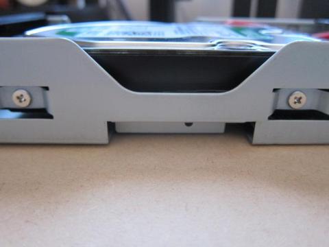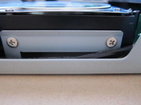 ⑥上面と下面にある各2カ所のHDD固定ネジを取り付けるのですが,片側は真ん中のネジ穴が無いので,3カ所の固定となります.3カ所固定されれば,がたつきはありませんが,振動には弱くなりそうです.