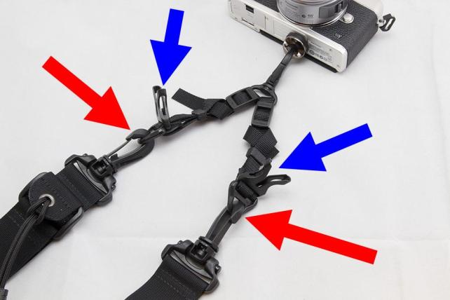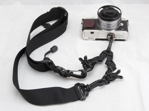 あくまでカメラの両脇のストラップホールに接続ベルトを着けた時に、簡単に手持ちの短いストラップに変えられるというもので、私の様に三脚穴を利用し逆さ吊りにする者にとっては不要のモノでした。