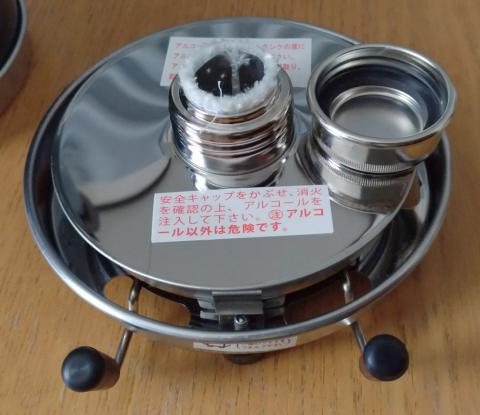 蓋を外すとコンロに早変わり。真ん中の穴から燃料用アルコールを投入出来ます。満タンで80ccですが、量を測るのが難しいかと言うとそうでもありません。