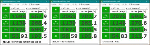 一番左は吊るしの状態で、シーケンシャルリードが遅いです。そこからWindows10標準機能のフォーマット(クイックではなく通常の)を5回ほど実行したのが、中央のデータです。これで十分です。今回は念のためErase Disk(全領域を0で上書き)を3回ほど実行しました。