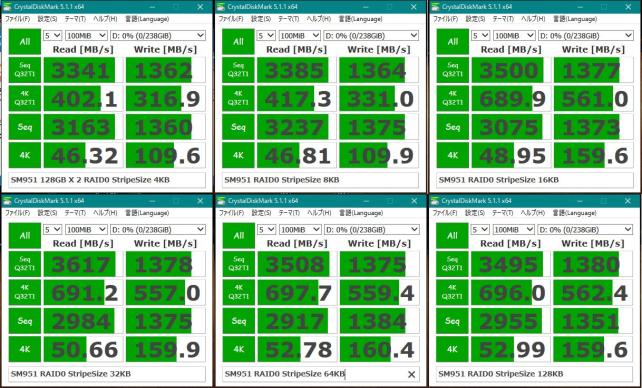 ストライプサイズは4、8、16、32、64、128KBの6種類、テストデータは100MiB、500MiB、1GiB、4GiBの4種類となっています。