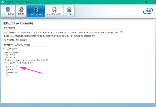 iRSTのライトキャッシュがデフォルトで”なし”に設定されています。