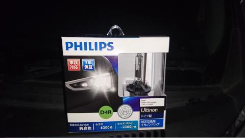 今度はヘッドライトの電球が切れてしまいました。ライトのスイッチを入り切りすればまた点灯するのですが、いつ完全に点かなくなるか判らないので、急いで購入しました。純正品を取り寄せると1個で1万円ぐらいするので迷ったのですが、やはりちゃんとD4Rの物を付けたいと思いPHILIPSの2個入りの物を選択しました。