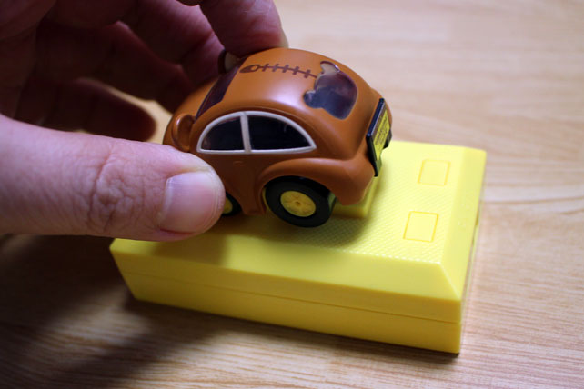 3点の接点の上にのせて10秒充電し、充電器上のAボタンまたはBボタンを選ぶと、自動で車が走り出します。