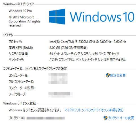 もともと P772/E は Windows7 Pro の 32bit版だったんですが、Windows10 へアップグレードして認証をしてから、Windows10 Pro の 64bit版をクリーンインストールしました。