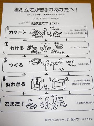 組立が苦手な人は、部材だけ見て身構えてしまいそうですが、A4両面 2枚の組立説明書とは別に「組み立てが苦手なあなたへ!」という紙が一枚入っていました。