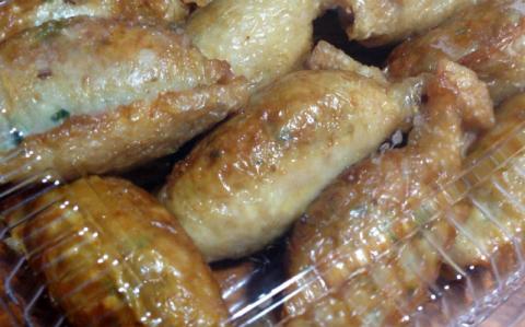 鶏皮で餃子の具を包んだジューシーでおつまみにぴったりな商品。